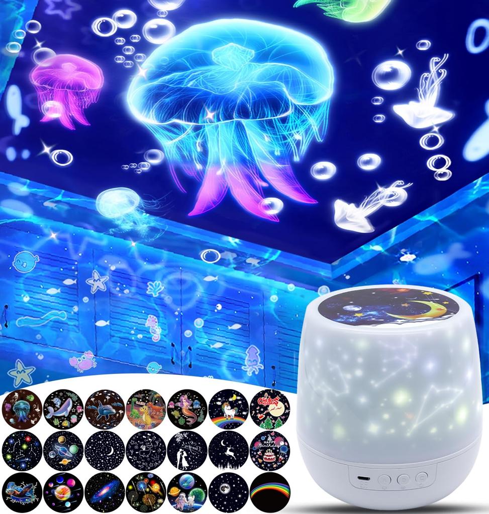 [Wiele trybów oświetlenia i obrót o 360 stopni] Projektor jest wyposażony w lampy w 3 kolorach: białym, niebieskim i żółtym oraz ma 6 różnych trybów oświetlenia (biały, niebieski, żółty, tryb snu, światło do biegania, tryb pełnego światła) w tym jednokolorowe i mieszane. Po utworzeniu możesz dodać 15 typów filmów i wzbogacić swoje wrażenia wizualne podczas projekcji o ponad 60 typów. Projekt obrotu o 360 stopni, bardziej interesujący. Może być nieruchomy i obracać się w zależności od ustawień. Możesz także ustawić go na swój ulubiony kolor i włączyć, aby stworzyć wspaniały wieczór. Dzięki 21 rodzajom filmów projekcyjnych dostosowanych do gustu Twojego dziecka, rodzice i dzieci mogą wspólnie cieszyć się fantastycznymi przeżyciami, które sprawią, że poczujesz się jak we śnie, na przykład spacerując pod rozgwieżdżonym niebem lub pływając pośród życia morskiego.