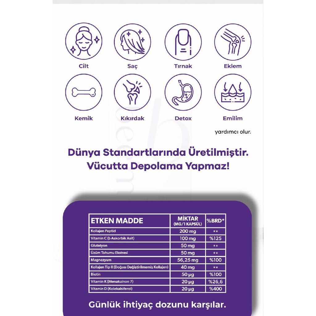 The highest level of skin elasticity, to remove skin wrinkles, to prevent wrinkle formation, to maintain skin tightness, to revitalize the skin, to be healthier of the skin, to be healthier, to the bone health, bone development, the hormones, the cleaning of toxic substances in the body and the skin, the elasticity of the vessels, the blood to be increased, It supports the formation of tissue, protection of blood vessels and heart, and strengthening the immune system.