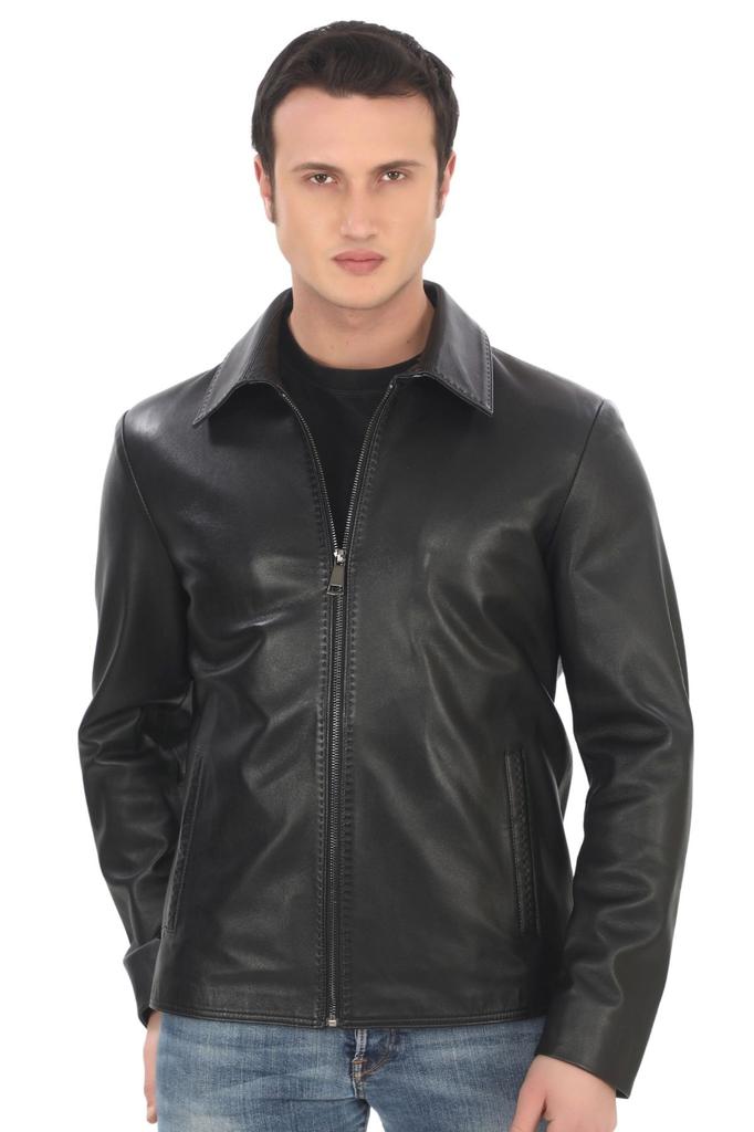Men's Genuine Lambskin Jacket Stylish Black Zippered Leather Coat Classic Straight Collar Handmade Leather Jacket