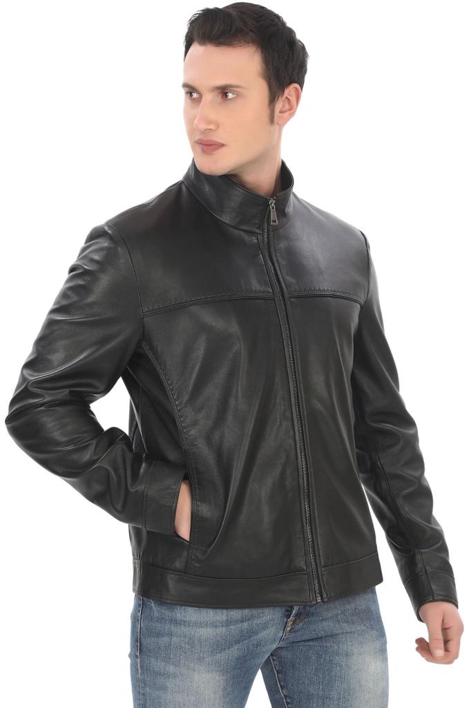 Men's Stand Collar Genuine Lambskin Jacket Black Zippered Stylish Leather Coat for Daily and Business Use