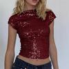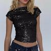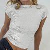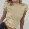 Lato Nowy Seksowny Bez pleców Casualowy T-shirt z cekinami Kobiety Okrągły dekolt Krótki rękaw Dopasowany Damski T-shirt Street Solid Prosty Y2K Damski T-shirt Top 26135