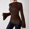 Wiosna Jesień Cienkie Plisowane Rozkloszowane Rękawy Casualowe Damskie T-shirty Eleganckie Kołnierzyk Stójka Slim Fit T-shirt Kobiety Odzież Prosta Vintage Baza Koszulki 26146