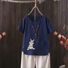 Perfect for summer, this casual T-shirt features a dragonfly print that draws inspiration from European and American styles. Made from a comfortable blend of cotton and hemp, it provides a lightweight and breathable feel. The short-sleeved and V-neck design adds a touch of elegance while ensuring an easy fit. Perfect for going outside in warm weather, this T-shirt effortlessly combines style with comfort.