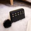 Ten stylowy portfel charakteryzuje się minimalistycznym, a zarazem eleganckim designem. Zewnętrzna część wykonana jest z wysokiej jakości materiału o fakturze, ma elegancki czarny kolor i pikowany wzór w romby, co nadaje jej wyrafinowany wygląd. Złote metalowe ćwieki są równomiernie rozmieszczone z przodu, dodając odrobinę awangardowego uroku. Do suwaka przymocowano puszysty, czarny pompon, który podkreśla jego modny wygląd. Krawędzie są starannie obszyte, a złoty zamek błyskawiczny tworzy ładny kontrast z czarnym korpusem.