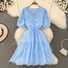Letnia mała świeża zmniejszająca wiek słodka bańka z krótkim rękawem, dekolt w szpic, haft z dziurami w pasie, dopasowana sukienka damska