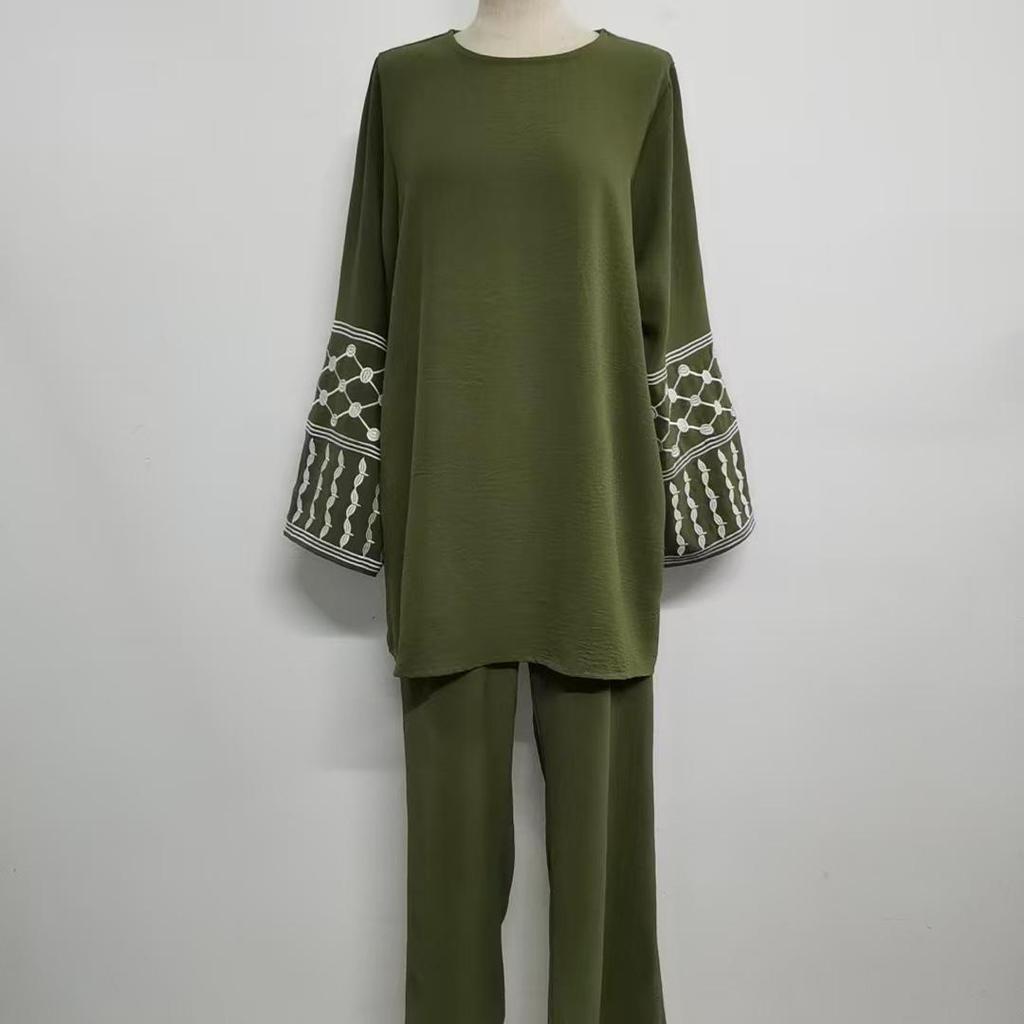 Poczuj komfort i styl w tym blisko-wschodnim haftowanym topie i garniturze ze spodniami z szerokimi nogawkami.. Ten zestaw o jednolitym wzorze, wykonany z wysokiej jakości poliestru, łączy sportową elegancję z kulturowym polotem.. Góra posiada misterny haft, który dodaje odrobinę wyrafinowania, a spodnie z szerokimi nogawkami zapewniają swobodny krój dla całodziennego komfortu.. Idealny zarówno na co dzień, jak i na specjalne okazje, ten wszechstronny garnitur pozwala cieszyć się modną swobodą przy każdym założeniu.