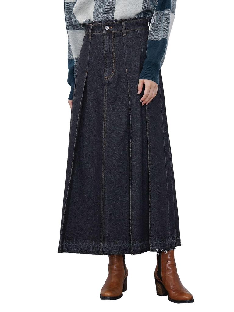 Long denim skirt with wide pleats. The cut-off details at the waist and hem create a mature accent. The back pockets are a little on the small side, keeping it from looking too casual.