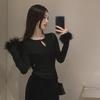 Damski Jesienno-Zimowy Wąski Aksamitny T-shirt z Długim Rękawem i Ażurowymi Wstawkami