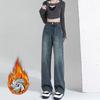 Damskie luźne dżinsy skórzane z wysokim stanem, podszewka pluszowa, ciepłe nogawki proste, mały rozmiar, grube spodnie z szerokimi nogawkami
