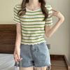 Short Sleeved Striped Knitted Sweater for Women In Summer Round Neck Fungus Edge Versatile Contrasting Color Short Style Slimming Effect on Clothes