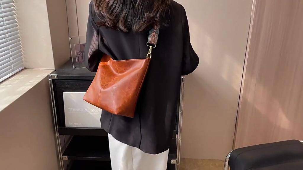 Vintage jednokolorowa PU skóra damska moda torba na ramię o dużej pojemności prosty szeroki pasek torebka typu Bucket Crossbody dojazdy do pracy