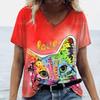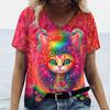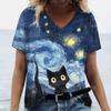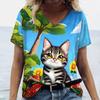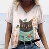 Letni Damski T-shirt Modny Wzór Kreskówkowy Kot Dekolt V Bluzki Koszulki Damska Codzienna Odzież z Krótkim Rękawem Damski Strój Vintage