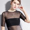 Transparent Mesh Base Shirt Women's Middle Sleeve with Inner Lining Tight Fitting Sheer Lace Short Sleeved Top Hollowed Out T-shirt