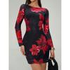 Damska wiosenno-letnia sukienka z gazy z kwiatowym nadrukiem, z okrągłym dekoltem, dopasowana, z długim rękawem