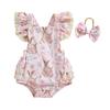 Ubranka Wielkanocne dla Dziewczynek Dziecięcych Kwiatowy Nadruk Króliczka Koronkowe Wykończenie Latający Rękaw Wiosenny Rampers z Opaską z Kokardą Zestaw 2 szt.