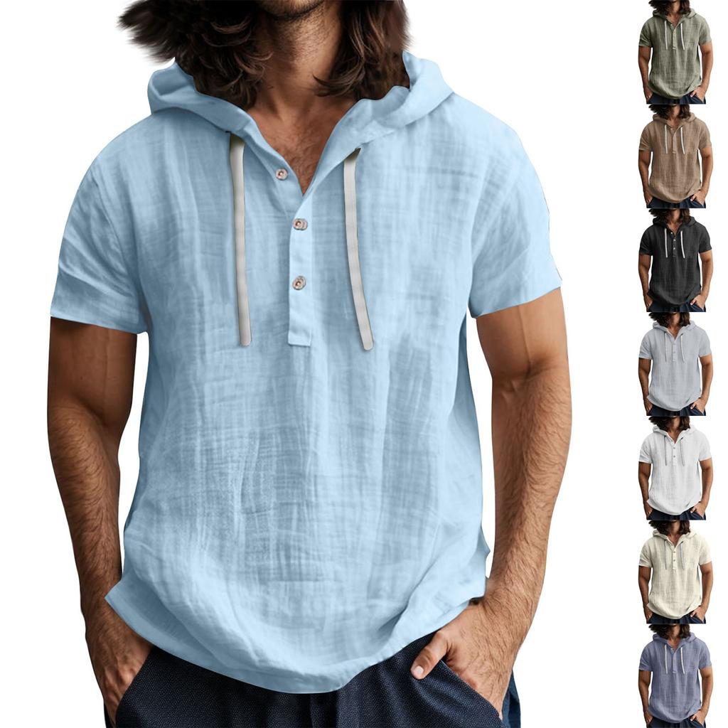 Męska koszulka z krótkim rękawem i kapturem, zapinana na guziki, z odkrytym dekoltem