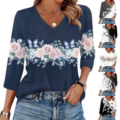 Damska koszulka T-shirt z nadrukiem, rękaw 3/4, codzienny, weekendowy, modny, podstawowy, z dekoltem w kształcie litery V, regularny top