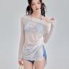 Damski trzyczęściowy zestaw kąpielowy: Bluzka z nadrukiem, Denim, Zakrywająca brzuch dla wyszczuplającego wyglądu, Konserwatywny styl gorących źródeł, Mały biust, Czysta elegancja.