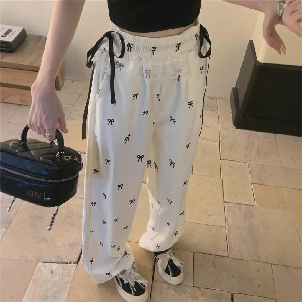 Women's Autumn Design Casual Bow Lace Splicing Elastic Waist Wide-Leg Pants