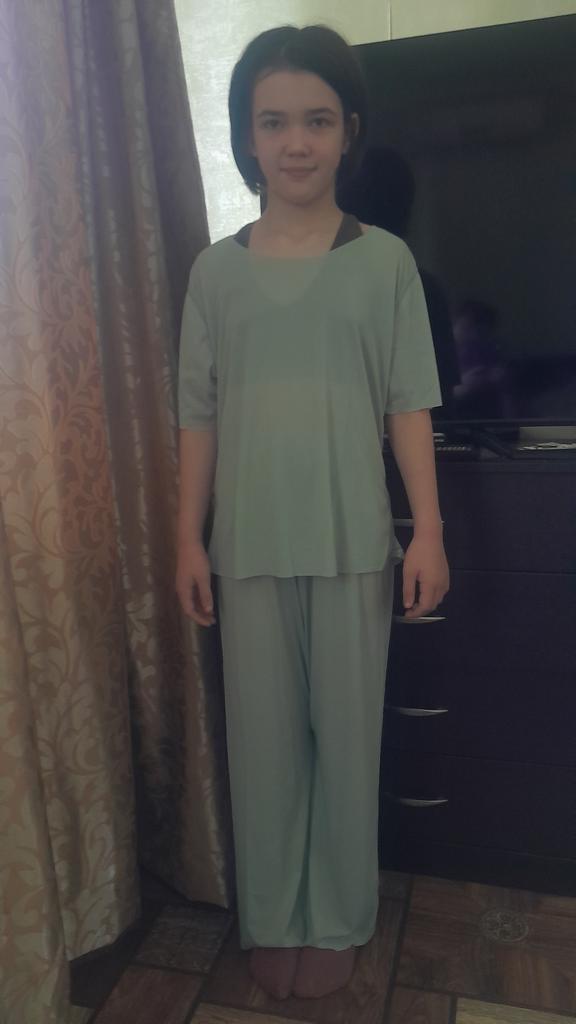 Rozmiar L(165/90) pasował na dziewczynkę o wzroście 140 cm, normalnej budowy ciała. Lekki, cienki, prześwituje, fason piżamy lub ubrania domowego, jak kto woli👍. Dziękuję, jesteśmy zadowoleni z zakupu.