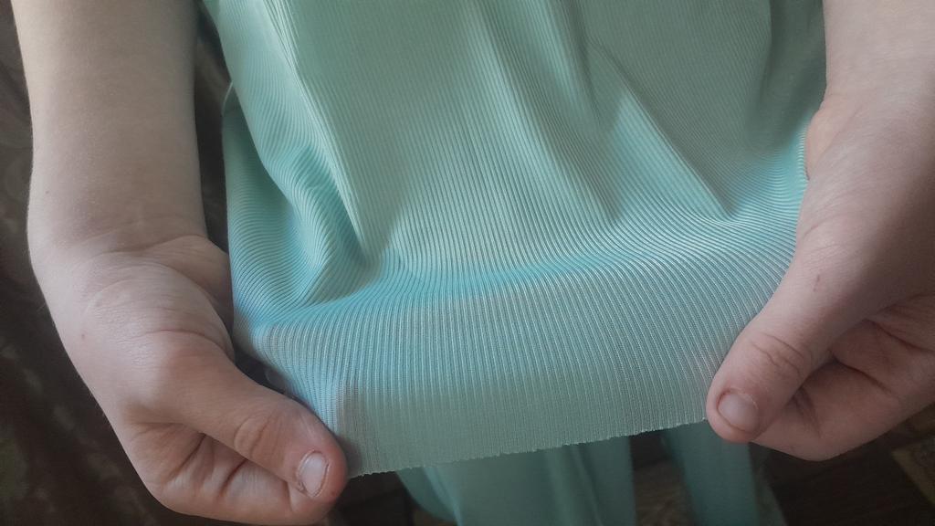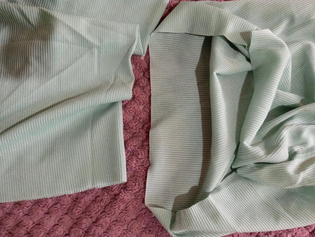Bardzo cienki dekolt nieobrobiony, krawędzie na spodniach i rękawach nieobrobione