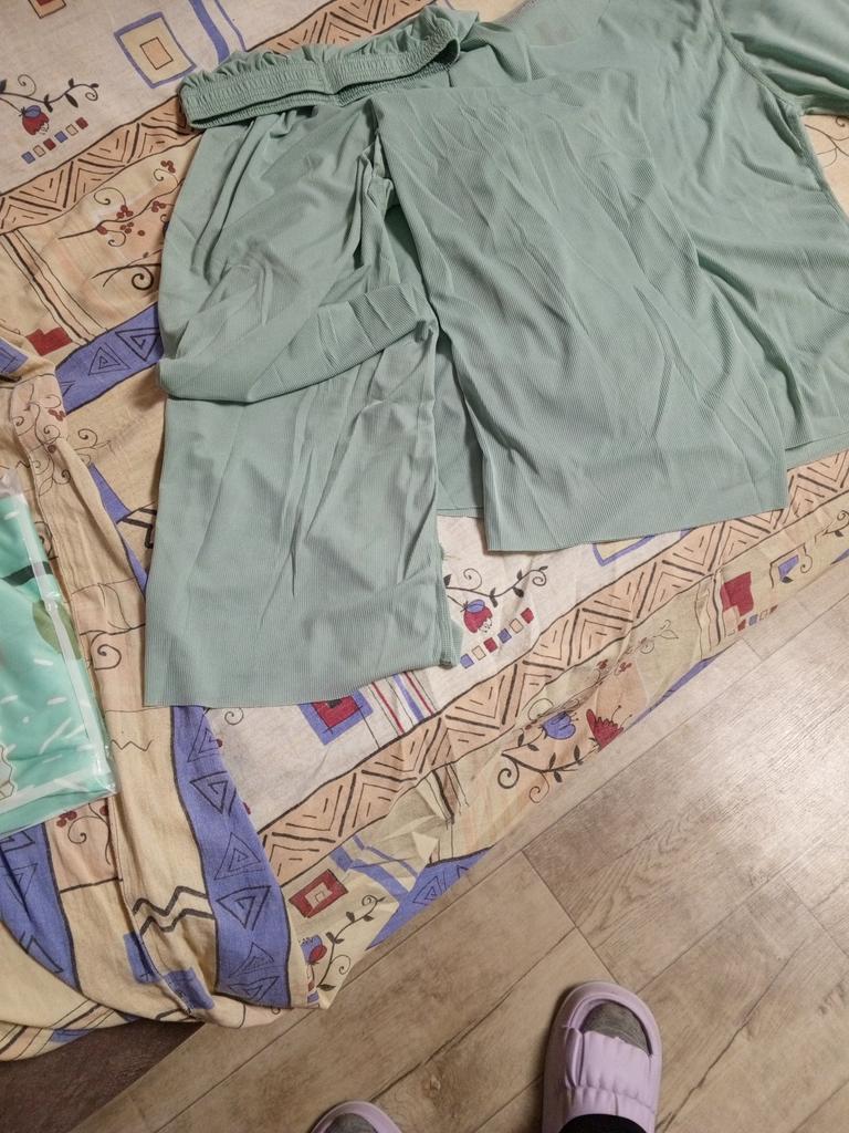 Mały, w ogóle mały, na rozmiar 48, nawet na moje 1,56 spodnie są krótkie, do kostki, tkanina lekka, letnia, brzegi bluzki nie są wykończone, do domu można nosić, ale na ulicę nie.