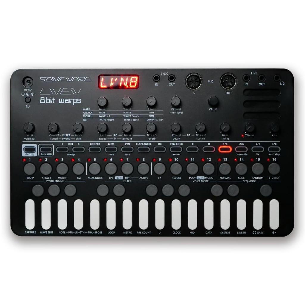 LIVEN 8bit warps is a synthesizer equipped with functions focused on machine live, four types of 8bit waveform memory synthesizer engines, and a step sequencer.