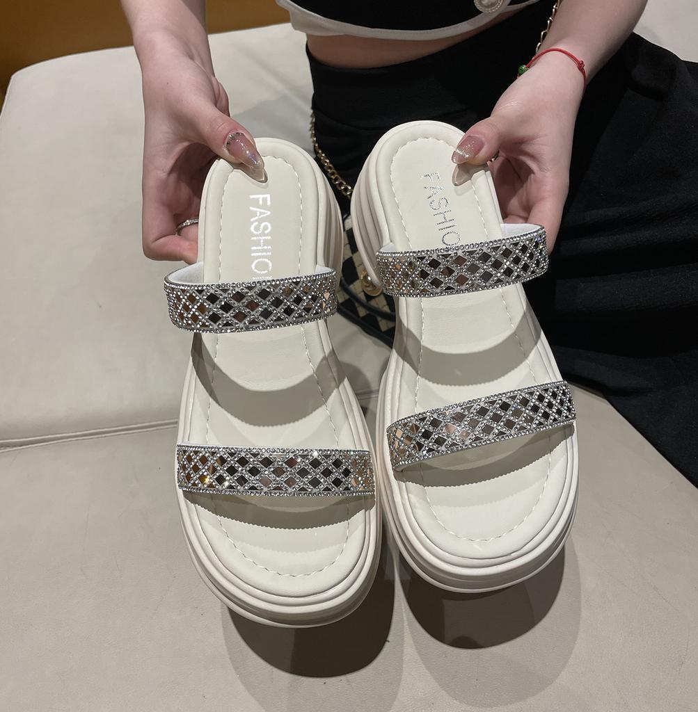Thick Soled Rhinestone Roman Sandals for Women's Casual Slope and Sponge Sole with Black Exposed Toes