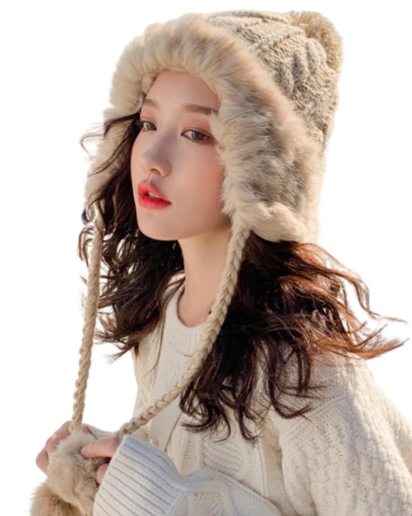 ✅; [Oczekuje się, że efekt będzie mniejszy na twarzy] Puszyste futerko wokół twarzy ma niewielką objętość i jest bardzo miękkie w dotyku, a połączenie z dzianiną jest super urocze! Ten dzianinowy przedmiot ma puszyste futerko, które owija się wokół twarzy, sprawiając, że wygląda ona na mniejszą.