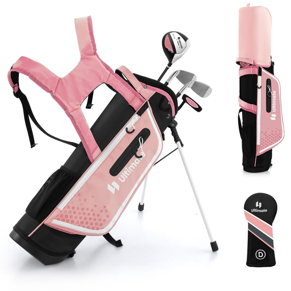 Zestaw GYMAX Club Junior, Zestaw kijów golfowych dla dzieci, dla dzieci w wieku 8-10 lat, Zestaw golfowy dla dzieci, dla początkujących, prawa ręka, 4 kije, w zestawie stojak na torbę golfową, główka