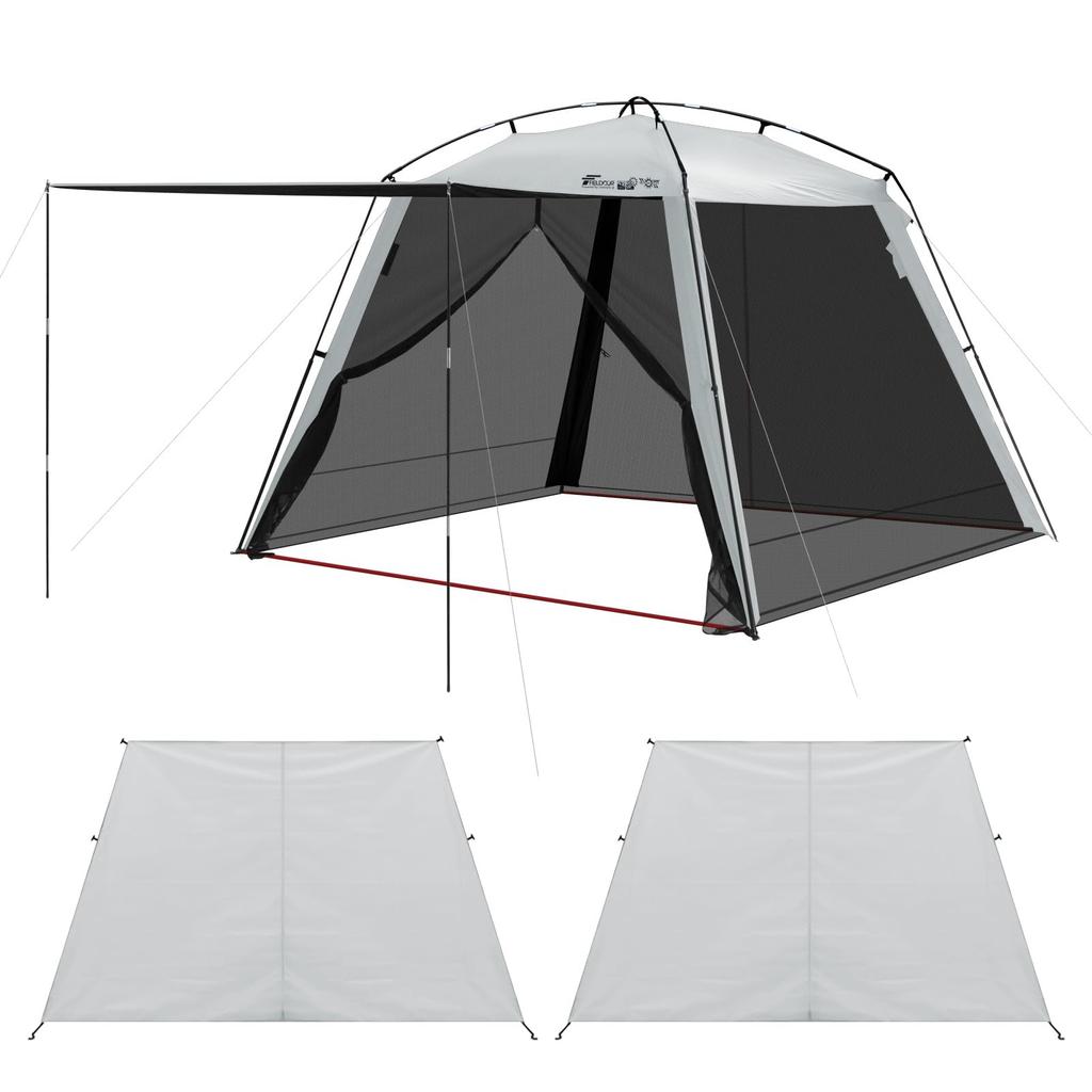 Namiot ekranowy typu całkowicie zaciemniającego, który wykorzystuje tkaninę z powłoką PU zaciemniającą. Dzięki przestronnym wymiarom 285 cm szerokości, tworzy komfortową przestrzeń, taką jak salon, podczas biwakowania.. Siatka po 4 stronach zapobiega również wnikaniu owadów.