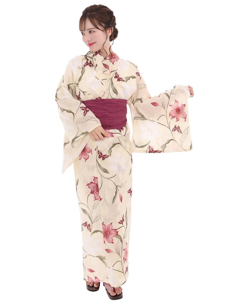 Yukata change set heiko AB size fits Scarlet Lily Butterfly [KYOETSU] set, weave, unbleached, two-part type, 4-piece (yukata, obi, underwear, geta),