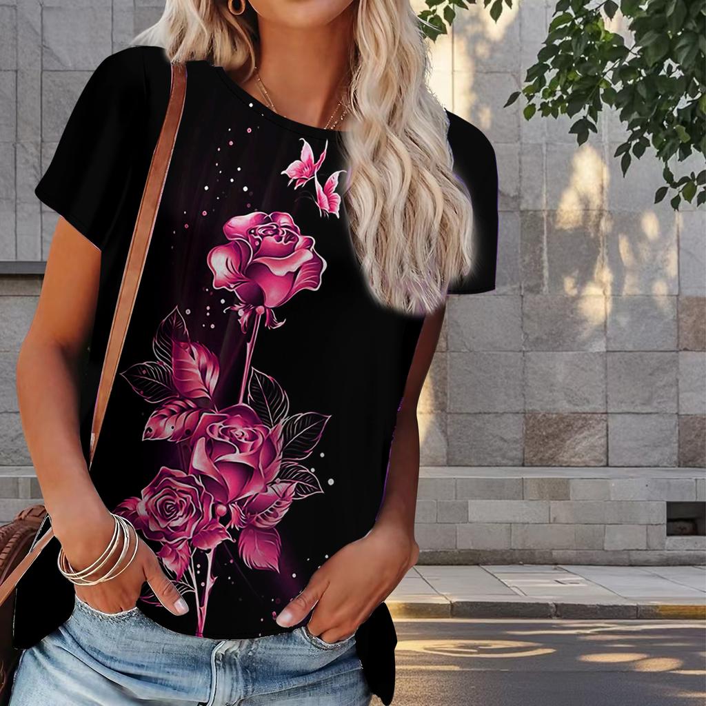 Damski Letni T-shirt z Nadrukiem Róży Retro Moda Krótki Rękaw Koszulki Casualowe Drukowane Topy