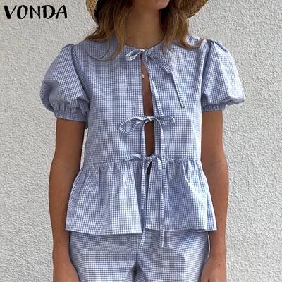 Damskie Letnie Koszulki Top z Bufiastymi Rękawami, Kraciastym Wzorem, Kokardką z Przodu i Falbankami