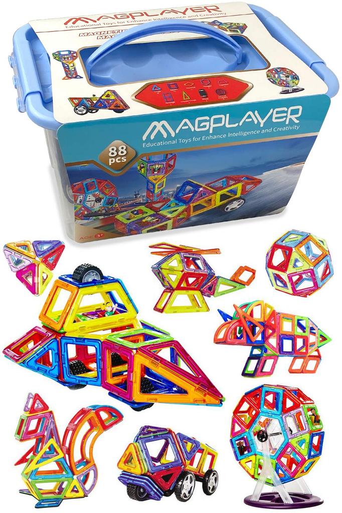 Zestaw podstawowych pojemników do przechowywania Mag Player, Zestaw zawierający części samochodziku, karuzeli i lalki, Zestaw zawiera pojemnik do przechowywania i przewodnik, Niebieski pojemnik, 90 sztuk