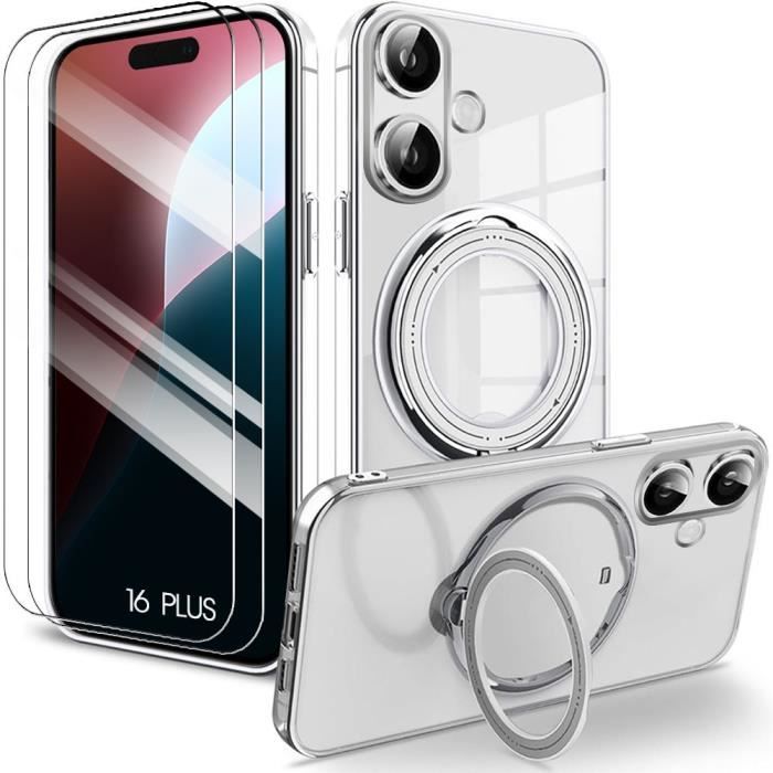 Coque + 2 Verres Trempés pour iPhone 16 Plus - Protection avec Anneau Magnétique et Bordure Argenté
