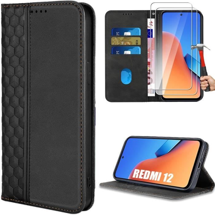 Coque et Verres Trempés Pour Xiaomi Redmi 12/12 5G - Cuir Synthétique Noir - Motif Mosaïque - Anti-Rayures