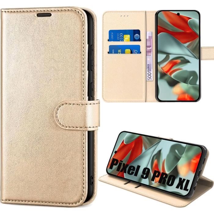 Coque Intégrale pour Google Pixel 9 Pro XL - Protection Effet Cuir Doré avec Support et Porte-Carte