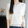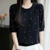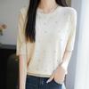 Damski zakrzywiony sweter dzianinowy z okrągłym dekoltem zdobionym koralikami - Krótki rękaw, wysokiej klasy letni top