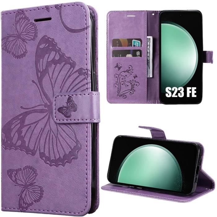 Coque de protection - Booling - pour Samsung Galaxy S23 FE - Antichoc - Effet Cuir Violet - Motif Papillon