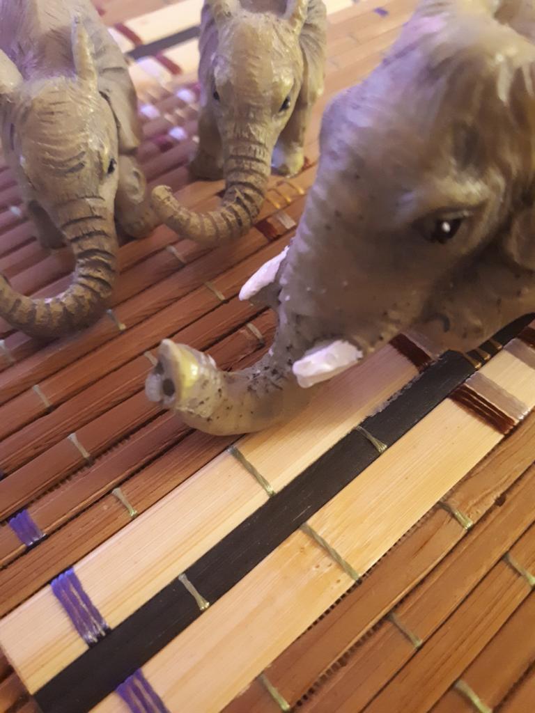 Zasmucony. Zamiast 3 - dwa słoniki. A duży ma złamaną trąbę