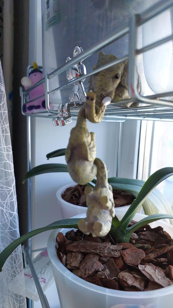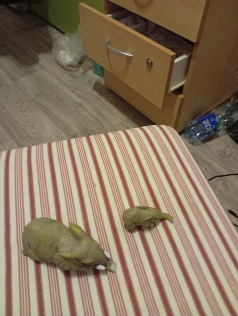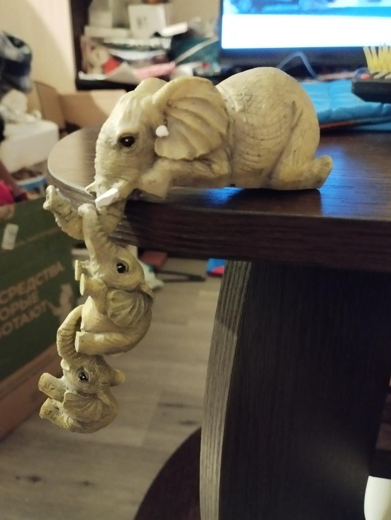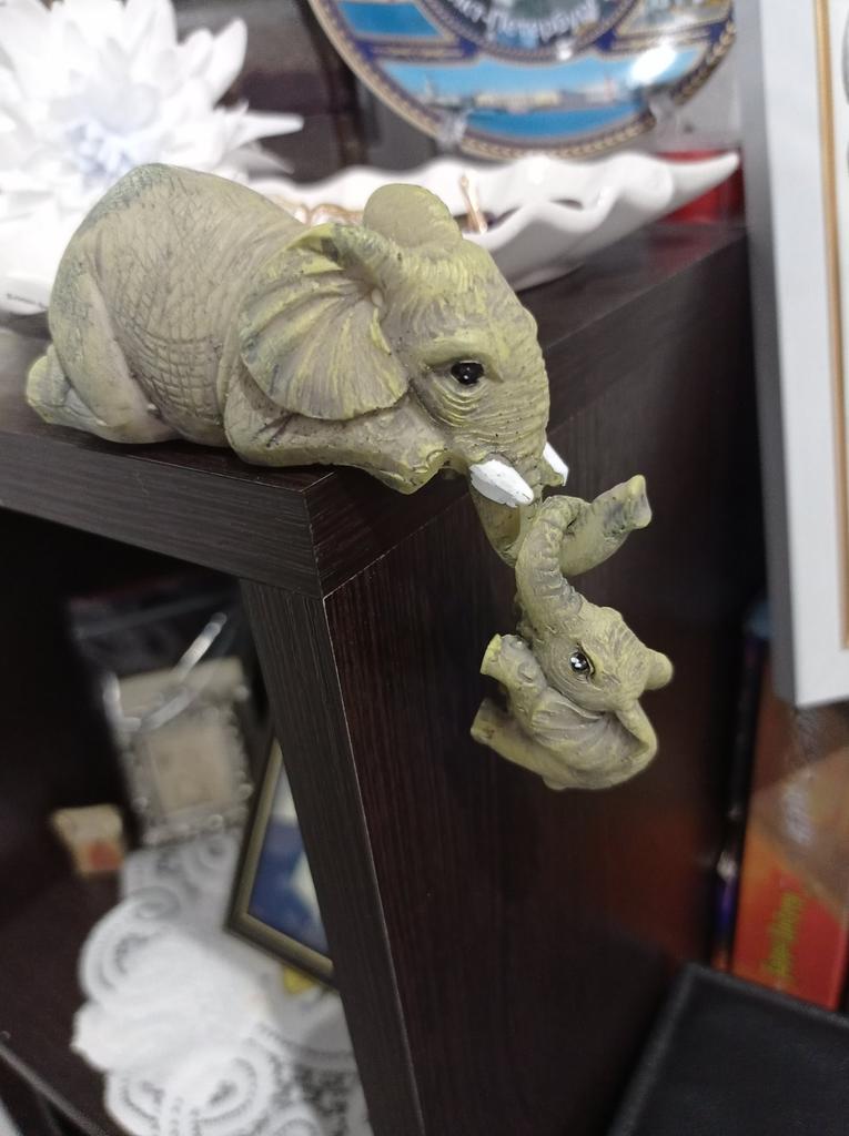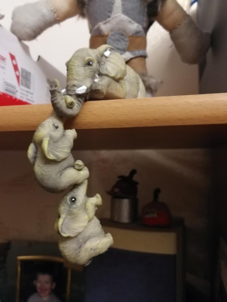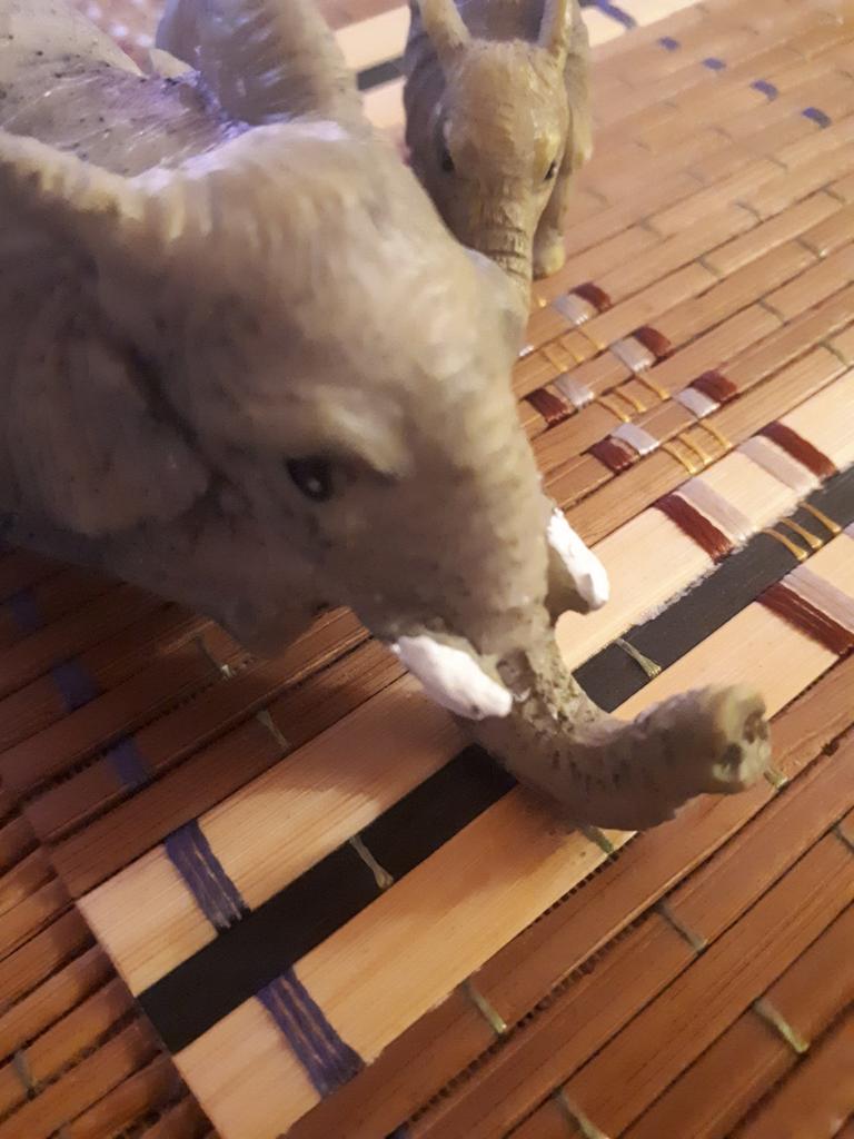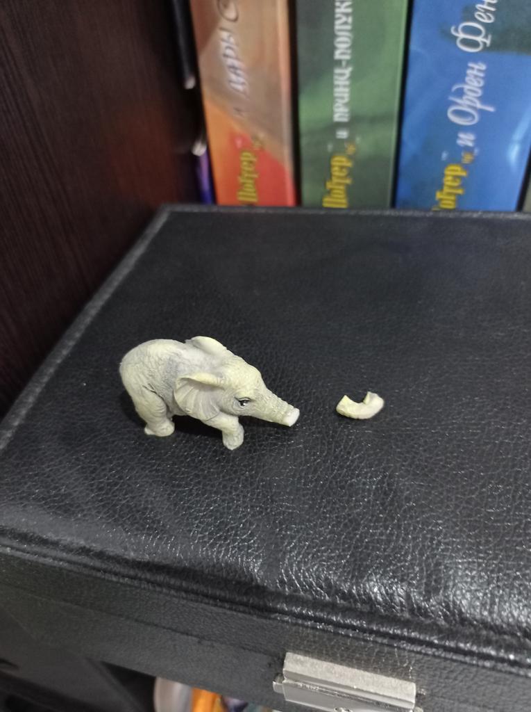 No cóż, jeśli w domu są zwierzęta, upadek jest nieunikniony, już przykleili trąbkę małemu słoniątku. Teraz wszystkie po prostu stoją na półce.