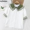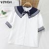 VONDA Women Naval Collar Bow Knot Short Sleeve Striped Buttons Up Blouse College Style