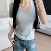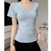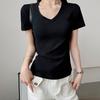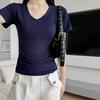 Navy V-neck Short-sleeved T-shirt for Women In Summer New Basic Style Front Shoulder Base Shirt Waist Slimming and Pure Sensual Top