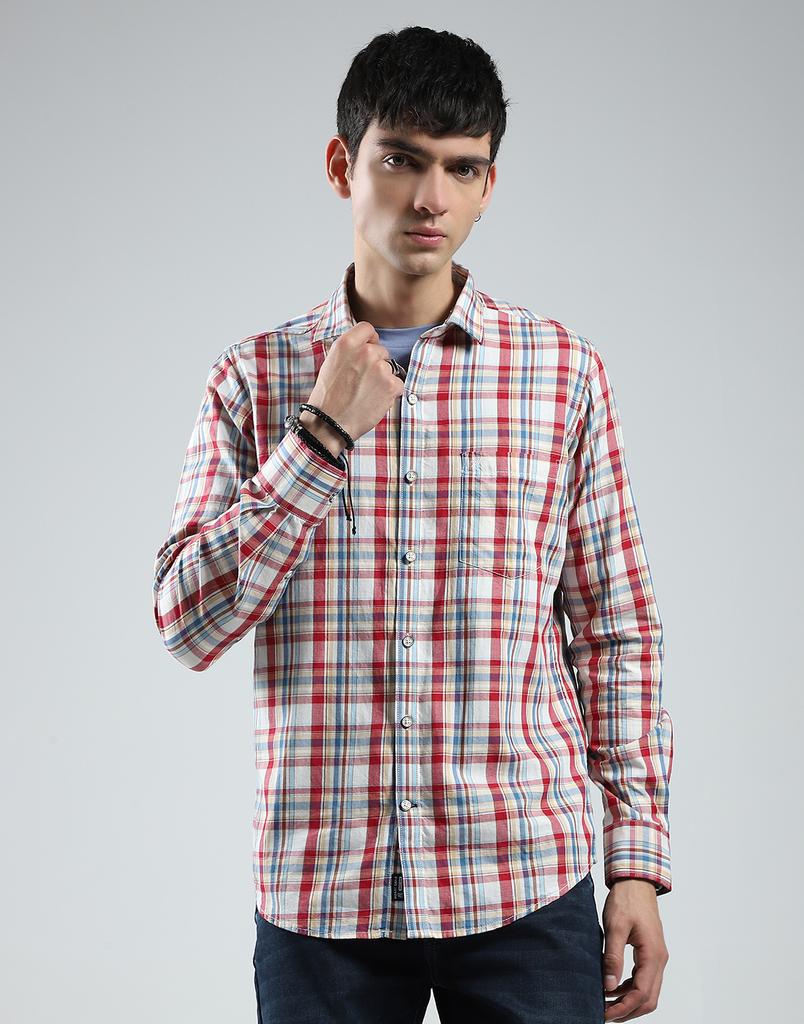 MONTE CARLO Męska koszula w kratę z czerwonym kołnierzykiem, z długim rękawem