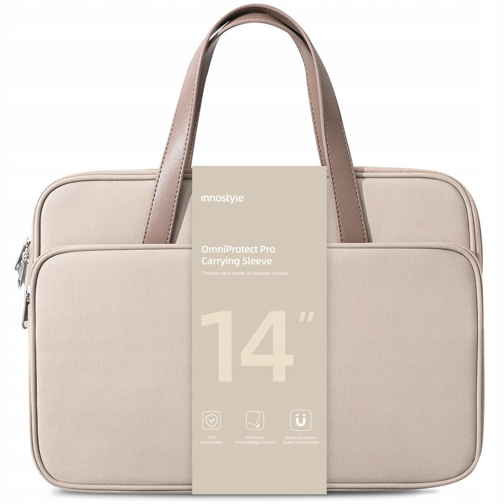 ✈️ Key features:Dimensions:36 x 26 x 6 cm 380gLaptop pocket dedicated to a 14" or smaller diagonal sizeSoft, padded laptop sleeve for shock protectionReinforced corners to protect your equipment from dropsPU material: Abrasion-resistant, durable and waterproofPatented YKK zips: Quick access and reliabilityErgonomic design: comfortable to wear all day longMagnetic external quick access pocketUnique colour scheme: stand out in the crowdWaterproof: don't even worry about the biggest downpourUltralight Design, weighing just 380g✈️ Kit contents:1 x Innostyle OmniProtect Pro - laptop bag up to 14" Waterproof Beige