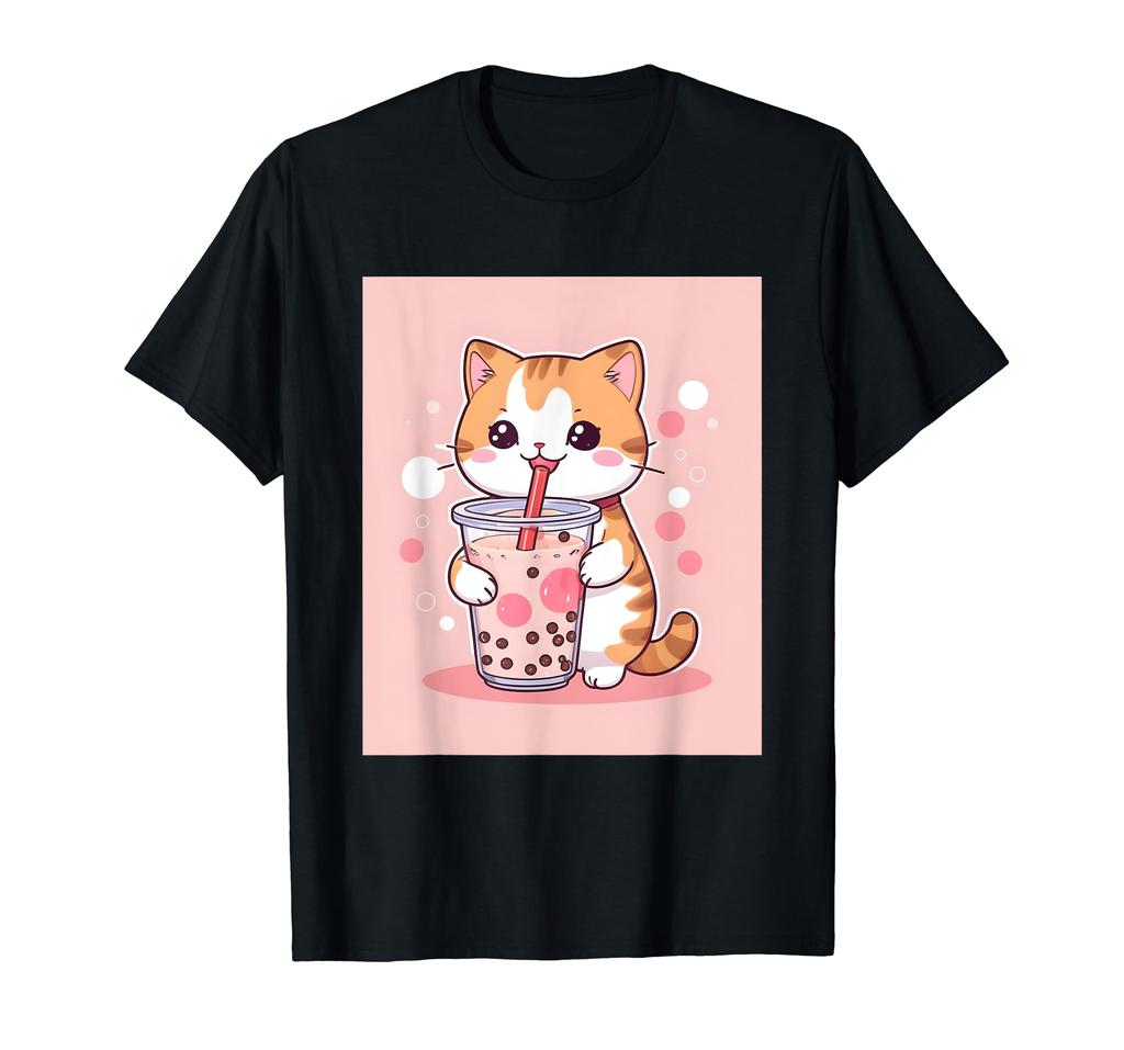 Rzeczy z bąbelkami z nadrukiem Kawaii, kot, boba, herbata, słodki, japoński, T-shirt