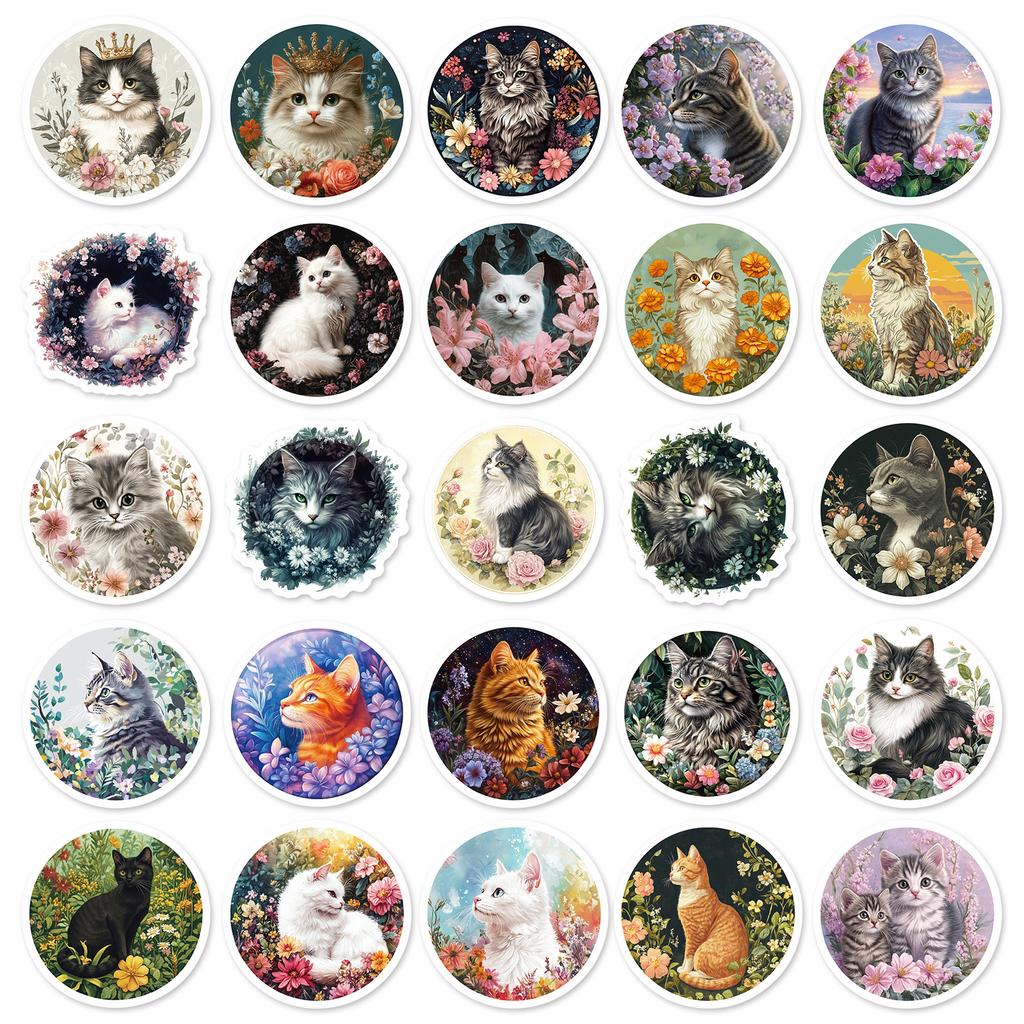 50 Round Retro Style Watercolor Cat Graffiti Stickers Floral Theme Non-Repeating Stickers