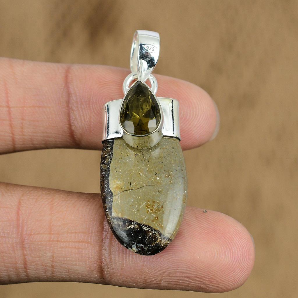 Naturalny septariowy wisiorek z kamienia szlachetnego Brązowy Srebro próby 925 Indyjska biżuteria