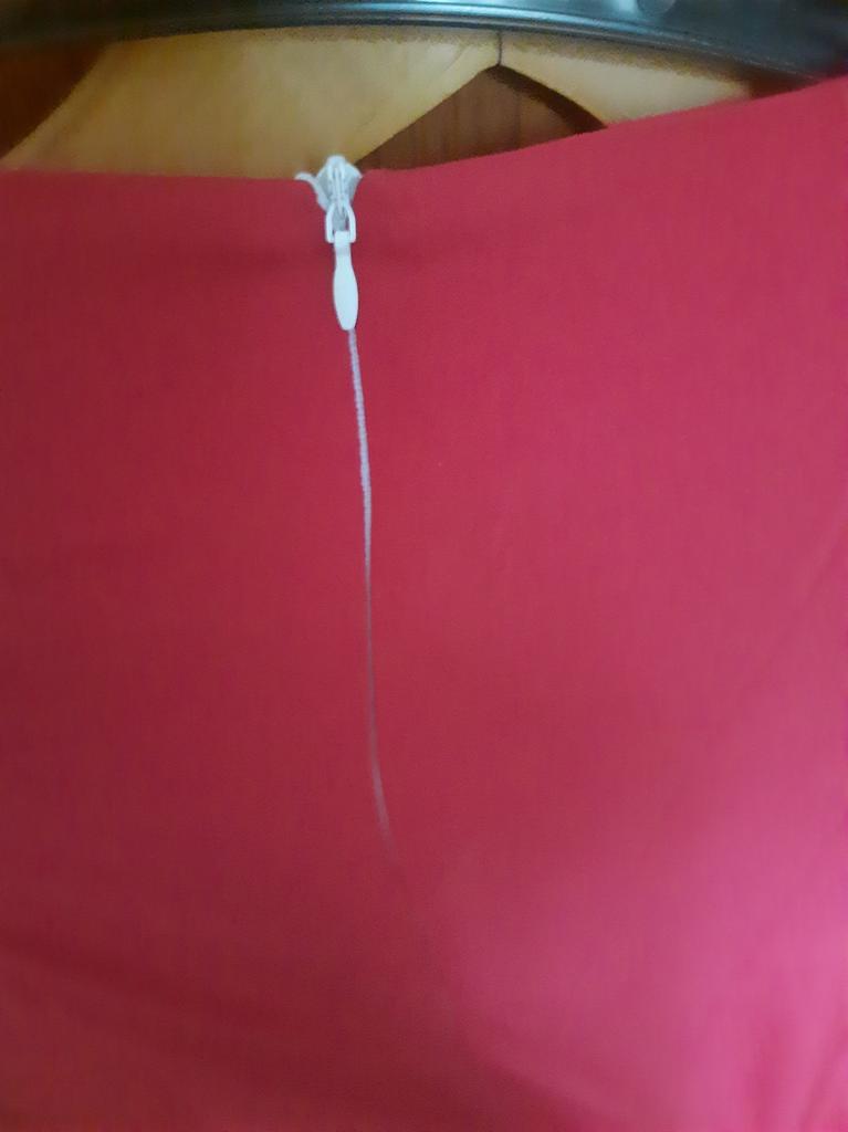 Sama sukienka jest całkiem niezła, rozmiarowo jest większa, fasonik super, chociaż poliester, ale! Wisienką na torcie jest biały zamek błyskawiczny na czerwonej sukience, który w dodatku jest przyszyty nie całkiem krytym sposobem, o czym w ogóle trzeba było myśleć, żeby do czerwonej sukienki przyszyć biały zamek.